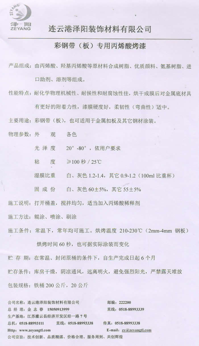 彩钢带(板)专用 丙烯酸(AC)烤漆